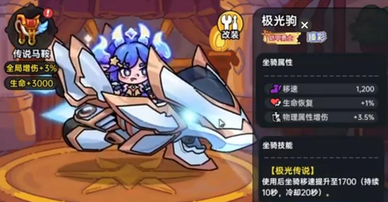 极光驹的设计融合了未来科技感与奇幻元素,通体散发着七彩光芒。坐骑表面会随着移动不断变换光效,在夜间场景中尤为醒目。极光驹还配备了独特的极光剑造型车头,在冲刺时会展开光翼特效。
