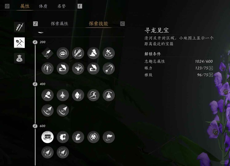 探索技能有个寻龙见宝很不错!可以先把需求的眼力和雅致弄达标。眼力提升途径是蹊跷收集和剑法比试,雅致可以寻找猫猫和品尝美食。美食就问燕叽厨师的位置然后去把他们的菜各买八个吃掉加得很快。