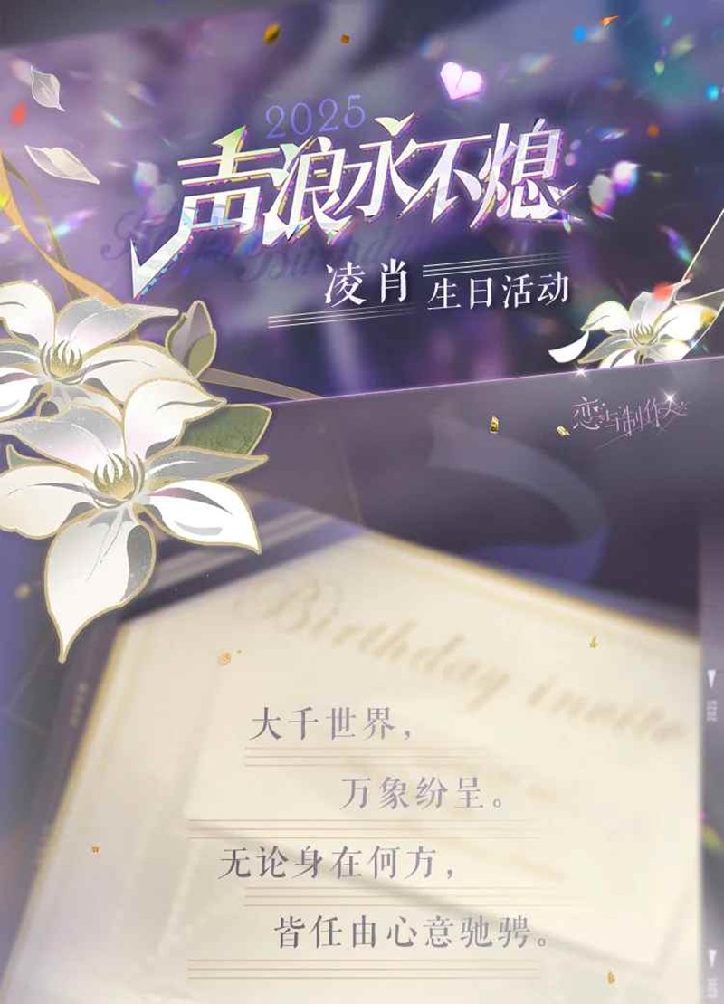 声浪永不熄 · 凌肖生日纪念,大千世界,万象纷呈。无论身在何方,皆任由心意驰骋。恋与制作人声浪永不熄:2025年凌肖生日庆典活动,获取生日R或纪念羁绊,即可开启专属生日主题约会【明天之约】。一起来和小编看看吧~
