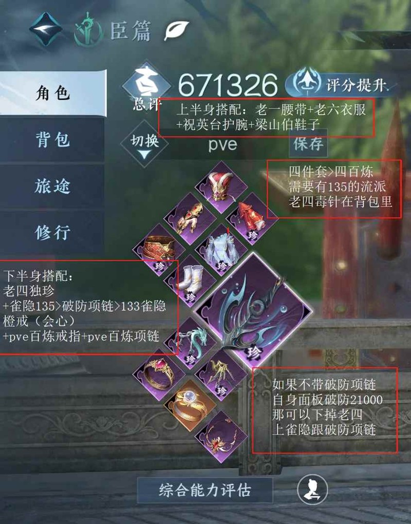 下半身搭配:老四独珍+(雀隐135>破防项链>133雀隐)+橙戒(会心)+pve百炼戒指+pve百炼项链