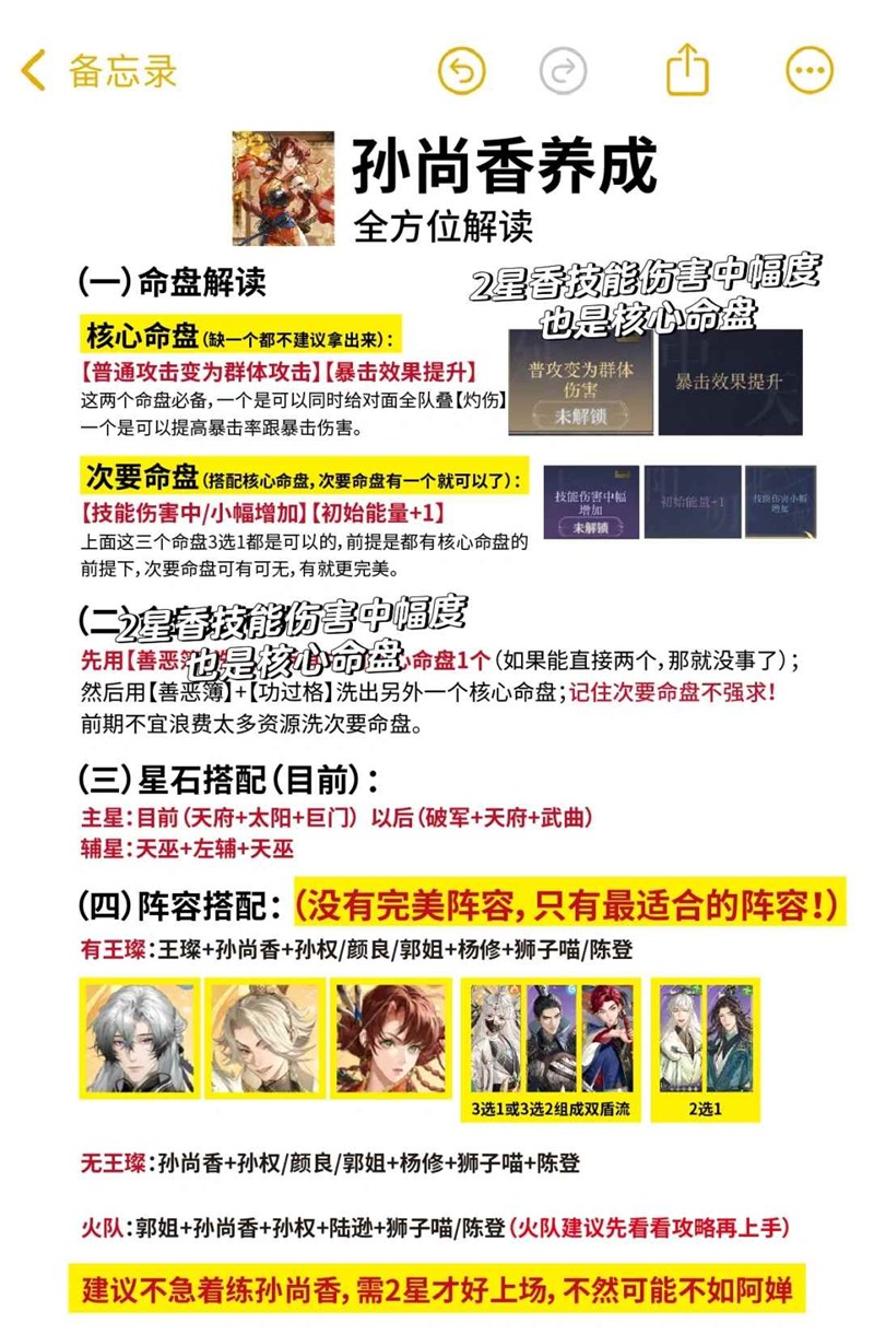 前期我们应该知道我们优先洗的命盘是谁,根据自身阵容,挑选1输出1奶1盾去洗就好。
