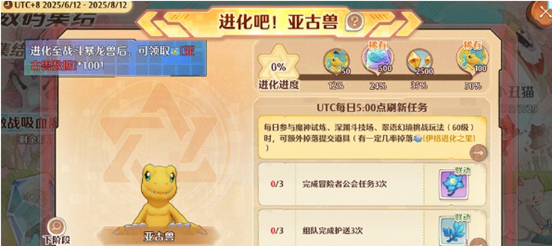 游戏内同步上线了"进化吧,亚古兽"支线活动。玩家每天完成任务可以获得进化道具,全服进度累计还能解锁更多奖励,包括亚古兽因子、进化数据以及联动专属家具等道具。这个活动鼓励玩家持续参与,逐步推进数码兽的成长过程。