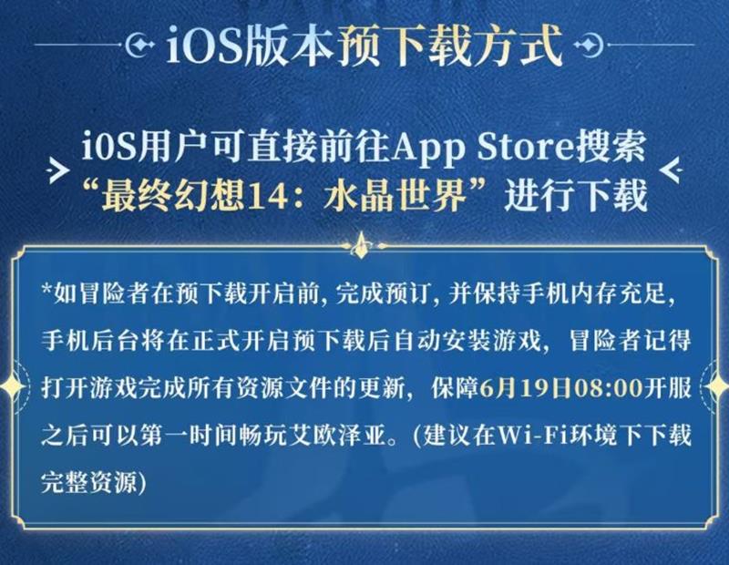 《最终幻想14:水晶世界》已于2025年6月17日08:00在官网微信游戏中心、00游戏中心、哔哩哔哩游戏中心、APPStore(苹果应用商店)、TapTap、4399游戏盒、好游快爆快手等平台开放预下载。(具体开启时间以各平台实际上架时间为准)