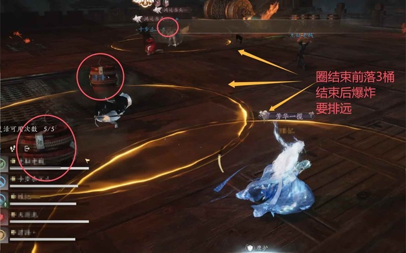 1.身上黄圈:队友身上出黄圈,立马拉走不要重叠,固定会在黄圈里掉落一个桶,要把桶炸掉!!炸掉!!(不然后面火海留太多桶扛不住);