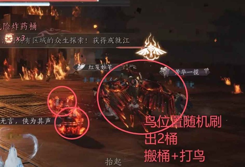 3.木鸟后的连爆桶:鸟走了之后,会落下2-4个连爆桶,地上会在桶四周出现黄色方框,立马把所有桶全搬!全搬!!!这个炸的速度比鸟还快,谁这时候还贪伤害不搬桶,下次打本别带他了;