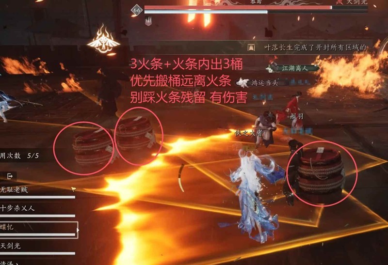 4.火海:火海一起,T立马拉boss到地图的最右侧,也就是地上会有条黄线,黄线的另一侧地上不烧伤害,然后不要管T,让T自己卸容鸢去。其他所有人立马!!!把所有的连爆桶全搬开!!!!只要不连就行!搬完就撤到T身边,奶妈在火海起炸前后开水人技能,可以保住5个人的,只要不连炸,不去火海那一侧。