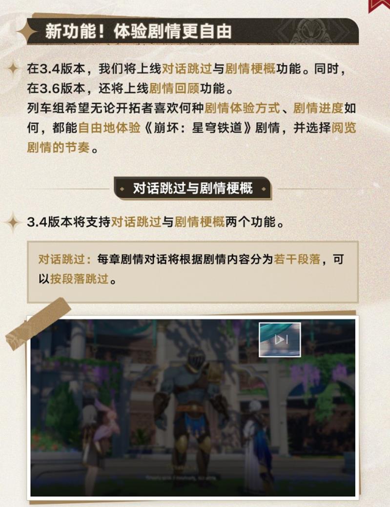 崩坏:星穹铁道3.4版本更新内容正式公布,其中最受关注的新增功能之一便是剧情对话跳过功能。这一功能旨在为玩家提供更灵活的游戏体验,让玩家可以根据自己的需求选择是否跳过某些剧情对话,从而节省时间或快速进入游戏的核心玩法。