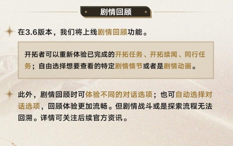 3.6版本将推出剧情回顾功能,玩家可以重新体验已完成的任务,并自由选择查看特定剧情情节或动画。