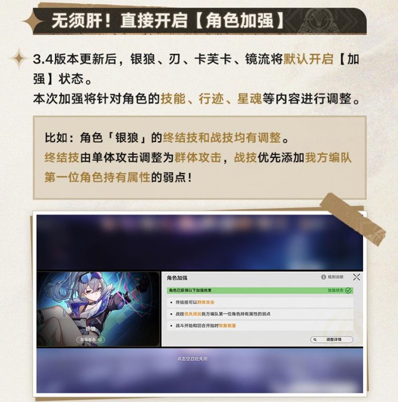 另外.4版本中,银狼、刃、卡芙卡、镜流四位角色将默认开启加强状态,涉及技能、行迹、星魂等多方面的提升。例如,银狼的终结技由单体攻击升级为群体攻击。玩家还可以自由切换角色的加强状态,关闭后角色技能将恢复至加强前的效果。