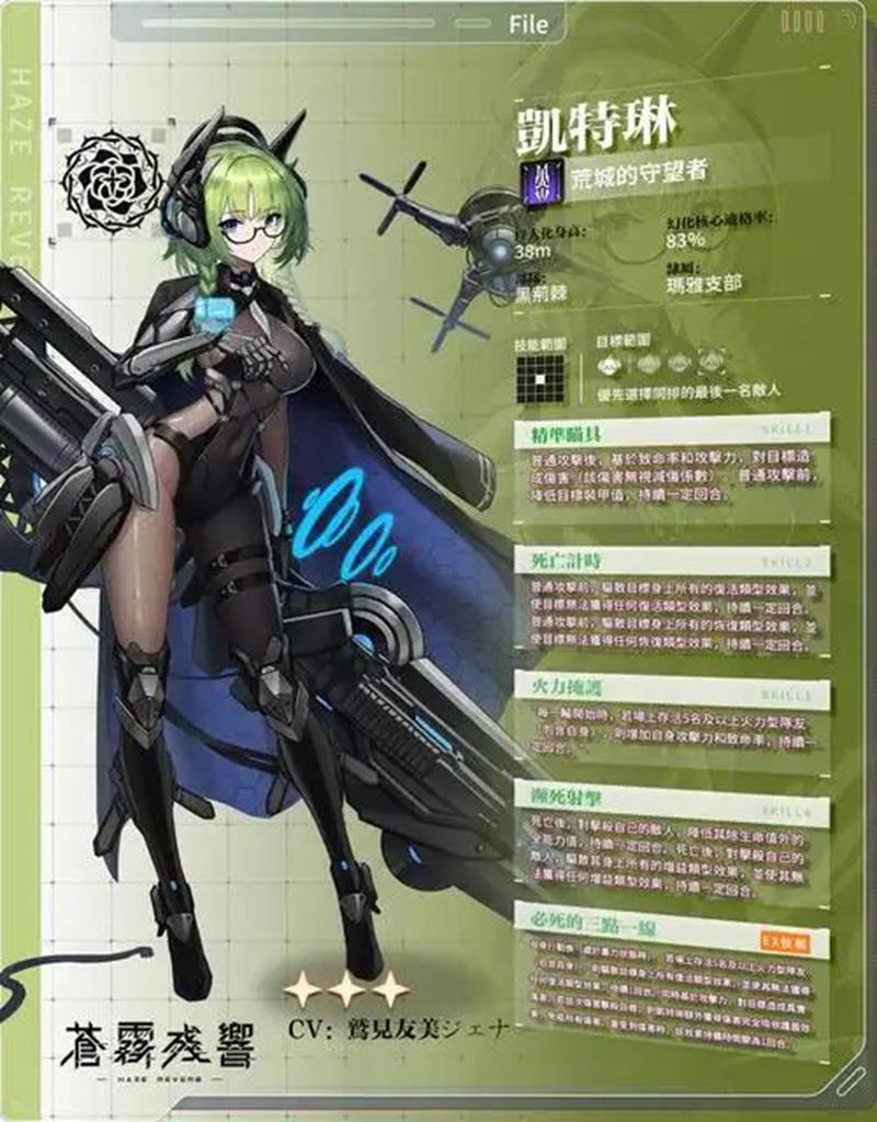 凯特琳是《苍雾世界》中的SSR驾驶员,属于火力型角色。她的技能机制独特,能够对目标造成高额伤害,并且在战斗中具有重要的战略意义。