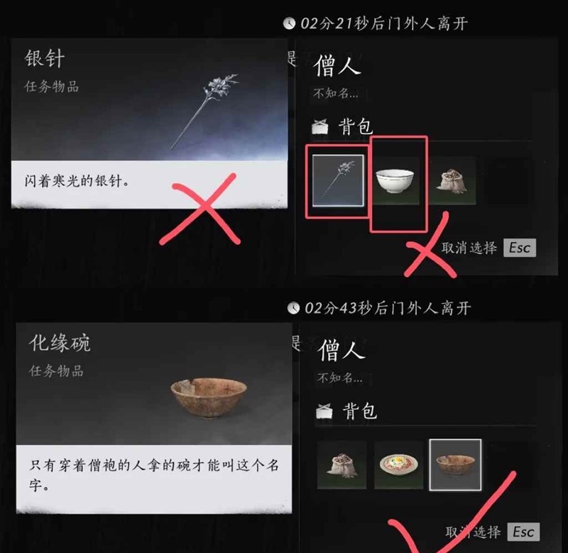 僧人∶白净的碗、匕首、银针、烧肉这些东西出现一样就直接叉出去,化缘碗、蛤蜊或三蔬杂菇、草药可以开门
