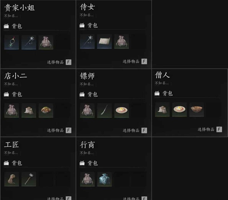 普通类∶镖师,侍女,工匠,店小二,贵家小姐,行商,僧人