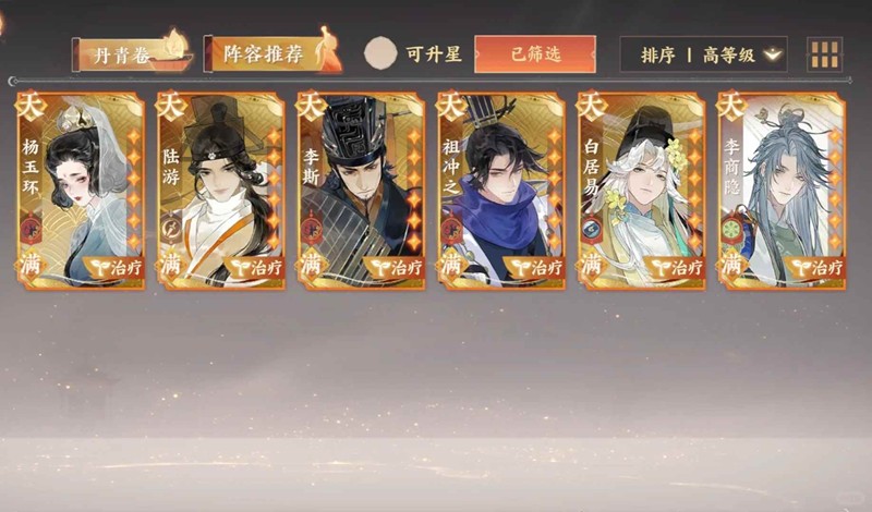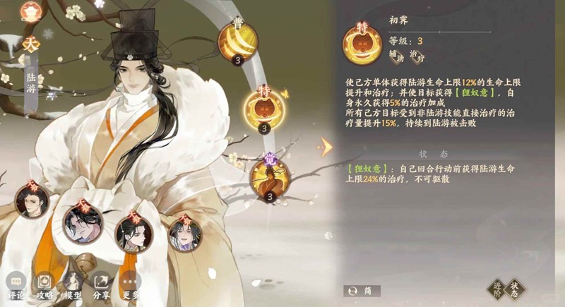 杨玉环/陆游/白居易的治疗量都跟自身的生命值(生命上限)有关,所以装备方面衣帽选用生命加成,鞋子小生命,其余配饰和武器选择小防御/防御加成。装备除通用承佑外,杨玉环推荐端华/沧浪,陆游推荐沧浪/风荷,白居易推荐沧浪。(沧浪更适合两火大招的功能性名士,自带解控稳定发挥)。