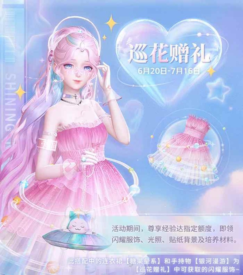 闪耀暖暖巡花赠礼限时活动开启,获取闪耀单品,6月20日更新后即可获得。无数糖果色的小行星环绕在裙摆上的宇宙,记录下所有不期而遇的美好轨迹。尊享经验到达指定额度即可获得巡花的赠礼,踏上充满花香的惊喜旅程吧!