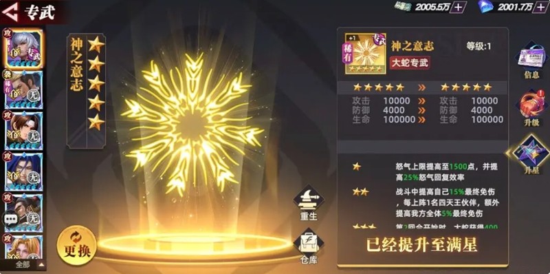 大蛇的专属武器"神之意志"能够提升怒气上限和回复效率,配合羁绊效果可以更快积攒怒气。随着专武升星,还会附加免伤效果,大大提升了大蛇的生存能力,让他不再只是单纯的玻璃大炮。