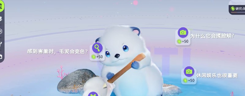 以游戏中的羞羞懒为例,这只白色毛发的萌宠拥有五个不同课题。其中包括了解它名字的由来、完成抚摸互动等任务。玩家可以通过游戏内置的搜索功能获取课题提示,快速找到完成方法。每个课题的流程设计都很简洁,带着宠物就能轻松解锁。