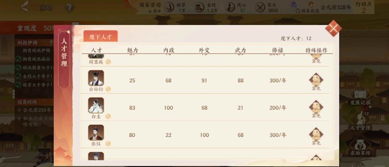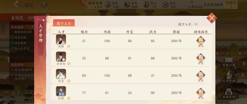 1.鄢郢两个城就算打不下两个,也要最少打掉一个。外交方面这时候公孙衍基本会来,不用犹豫,招募就对了,公孙衍后面就是张仪,不用担心,这俩在这个关卡不会跑路,白起不会这么快出来的,樗里疾记得招募,防守能手。内政和外交要稳住。
