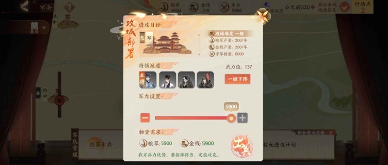 2.伊阙过了后,就是鄢郢,我们前面把鄢郢打了的话现在会舒服很多,差一个城的话就赶紧堆了,因为孙膑快没了,如图,我孙膑带樗里疾公孙衍司马错,别说5900打6000了,我5400都敢去赌这一把,拿头输。毕竟这时候我们内政人才就剩下白圭/魏冉,内政人才不多,可以打切记打!不然就被温水煮青蛙拖死了,情况不对再不甘心也要裁兵!及时止损!这是个人认为大秦本纪最难的位置了。