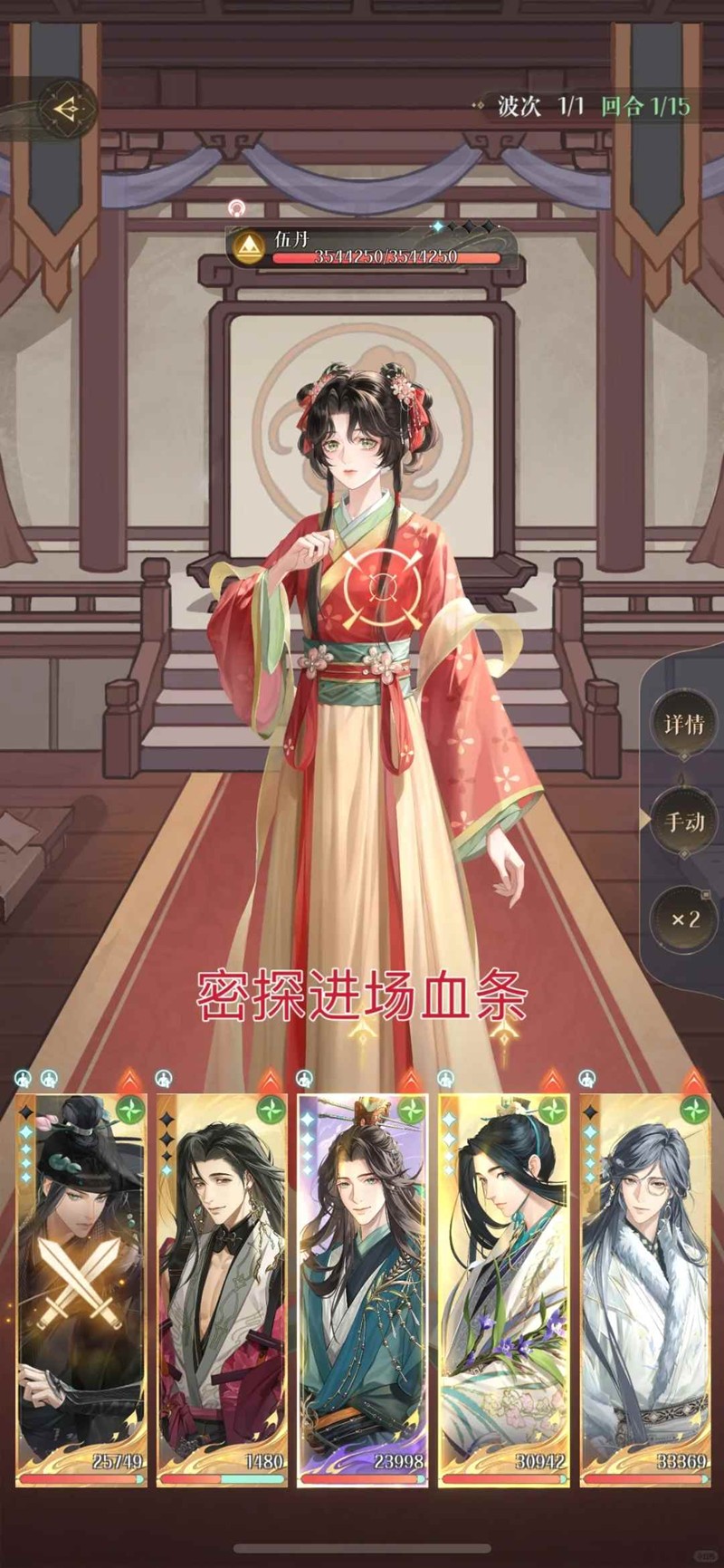 1. 我方上场的5个密探如果不是同一个属性,伍丹每回合会回复自身大量的血条