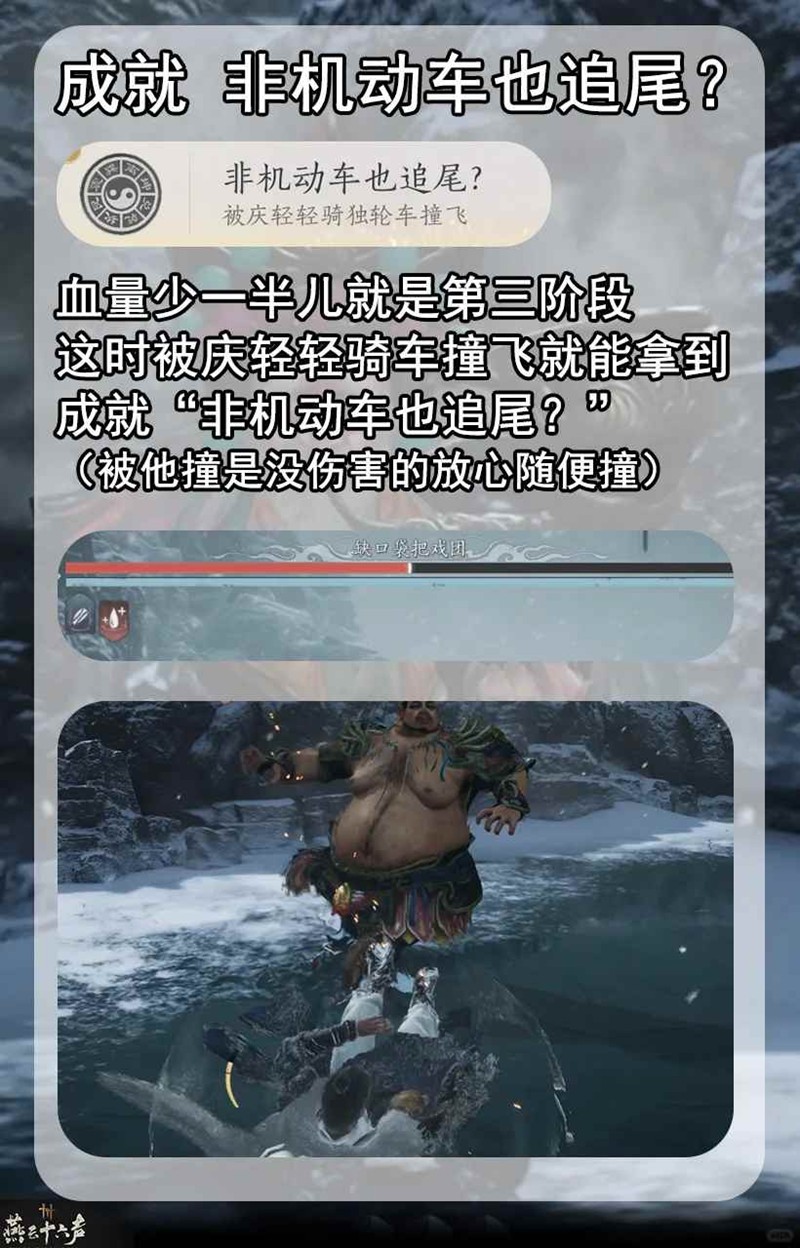 血量少一半儿就是第三阶段,这时候被庆轻轻骑车撞飞就能拿到成就“非机动车也追尾?”