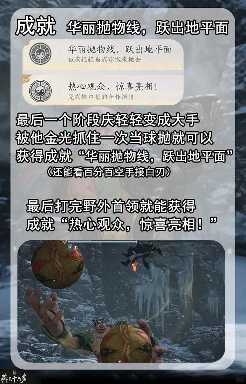 最后一个阶段庆轻轻变成大手,这时被他金光抓住一次当球抛来抛去可以获得成就“华丽抛物线,跃出地平面”(还能看百分百空手接白刃)
