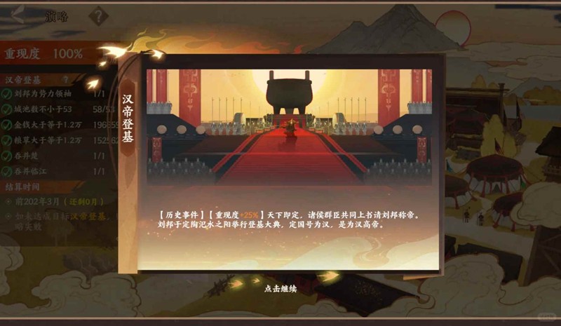 第三回合:还定三秦。第一个月就发展商业和农业,因为后面会触发历史事件,通关条件就会变。这回合最重要就是外交,因为当河南,韩友善>80且军力>1500会触发外交事件。过程请看攻略。