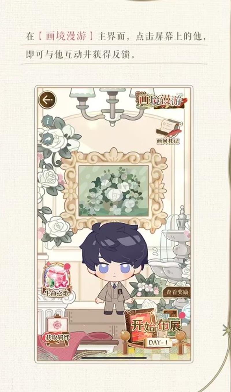 活动期间,每日首次完成画廊布展,即可阅读全新趣事剧情并获得李泽言专属手账贴纸。