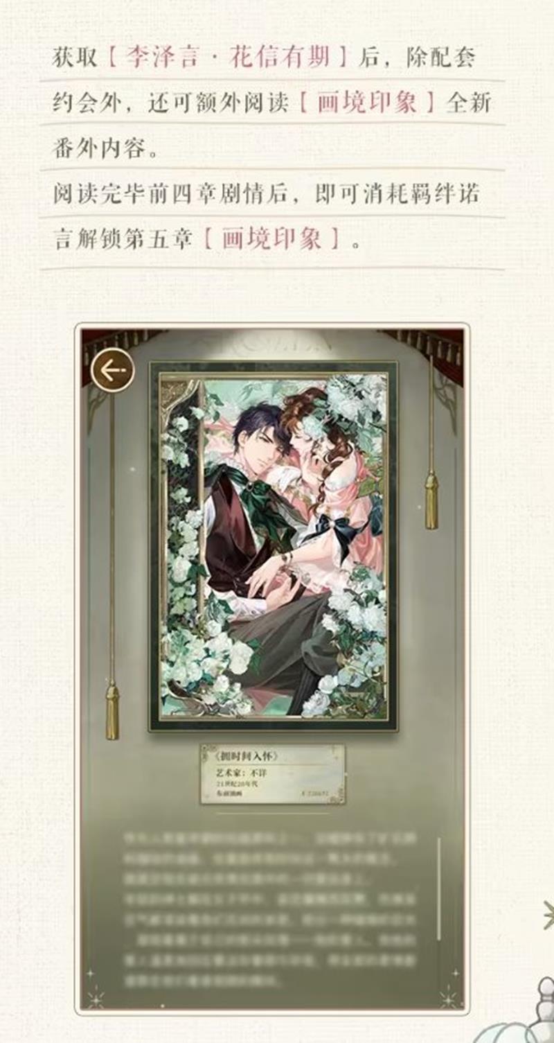 获取【李泽言·花信有期】后,除配套约会外,还可额外阅读【画境印象】全新番外内容。阅读完毕前四章剧情后,即可消耗羁绊诺言解锁第五章【画境印象】。