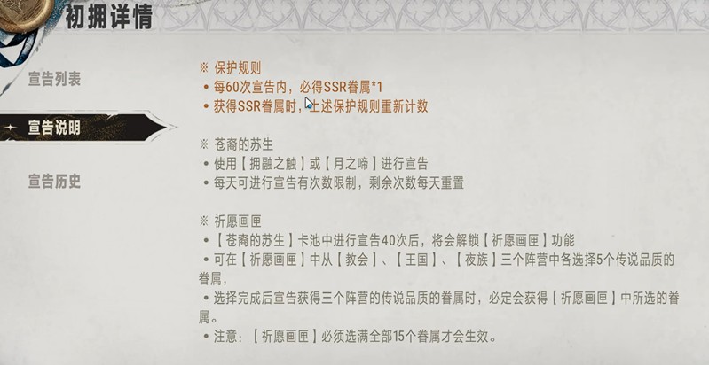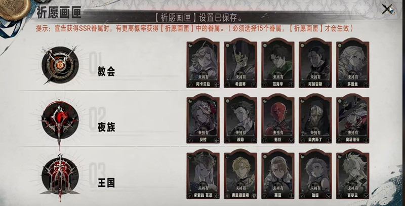 在常驻池中,玩家累计抽取40次后可以开启祈愿画匣功能。这个功能允许玩家从三个阵营中各选择5名SSR角色加入心愿单,共计15名角色。加入心愿单的角色在后续抽卡时会有更高的出货概率,这大大提升了玩家获取特定角色的机会。
