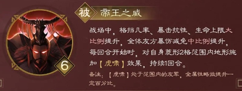 孙权的天赋技能帝王之威是其核心特色之一。该技能在战斗中能显著提升孙权的格挡几率和暴击抗性,同时增加生命上限。更关键的是,这个天赋还能为全体友军提供爆伤减免效果。每回合开始时,孙权还能在菱形两格范围内施加虎啸地形效果,为友军创造有利的战斗环境。