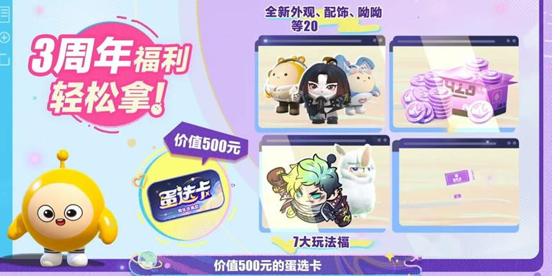 蛋仔派对三周年庆典即将于2025年6月27日盛大开启,为庆祝这一特别时刻,游戏为玩家们准备了丰富的福利和活动。其中,最引人注目的当属价值超过500元的蛋选卡免费领取活动。此外,还有典藏外观“冷面千金竹月”、84枚彩虹币、周年庆全新配饰等好礼等你来拿。