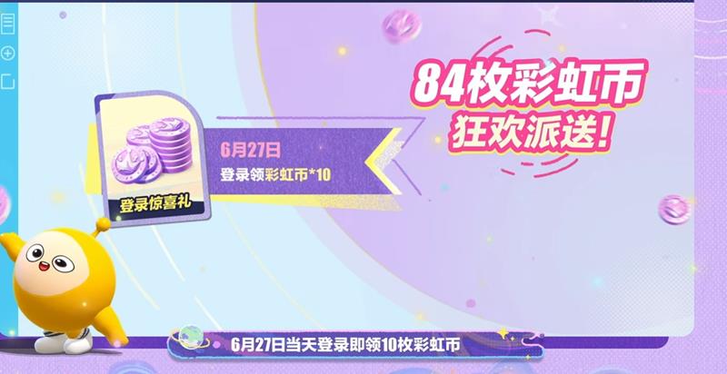 登录即领:6月27日登录游戏即可领取10枚彩虹币,活动期间累计登录5天总计可领50枚彩虹币。