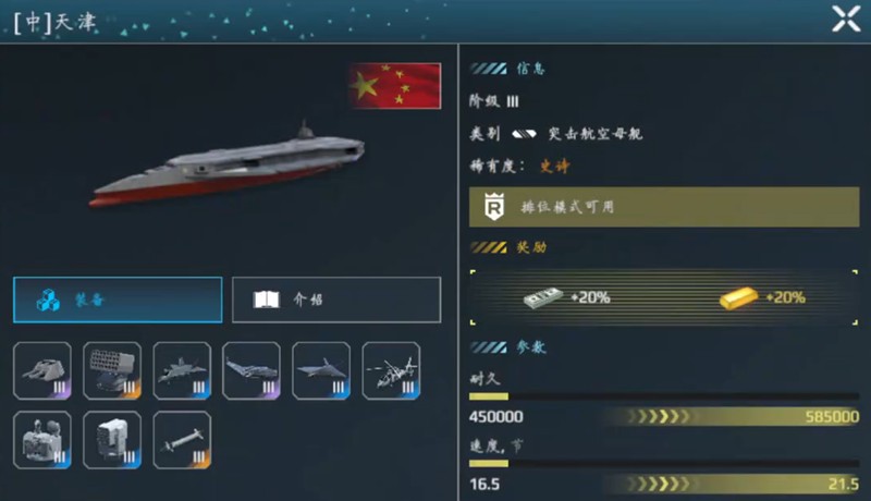 天津号可以说是当前版本的T0级航母,性价比极高。它拥有出色的基础属性,机动性和速度都很优秀。在武器配置方面,1门主炮、2枚火箭炮加上3架直升机的组合,让它无论是远程打击还是近身防御都游刃有余。