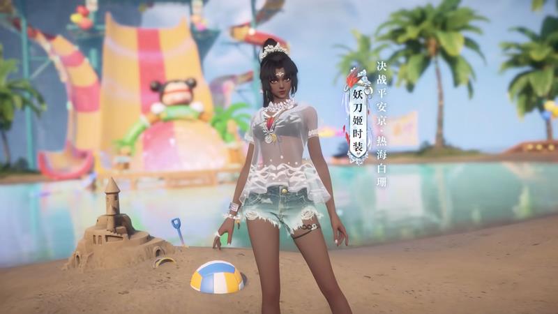 妖刀姬的夏日系列外观【决战平安京·热海白珊】将于7月3日上架商城。海风拂过的透纱短衫轻轻鼓动,古铜色的肌肤若隐若现,白色薄纱与黑亮皮肤形成强烈的视觉冲击,率性随意又透着几分热辣。破洞的齐腰牛仔热裤搭配腿环更衬双腿修长,充斥着火辣与野性糅合美感。手腕的银钏与白珊镯叠戴,时尚潮流。