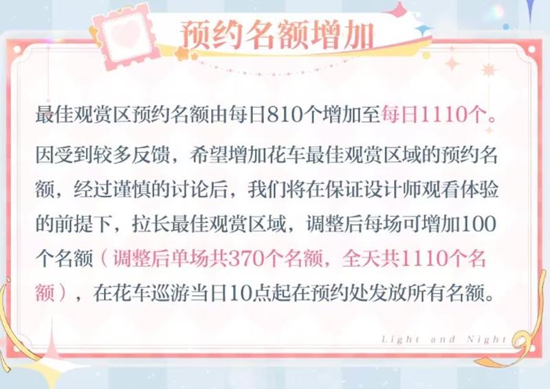 花车巡游日(6月28日-6月29日&7月5日-7月6日)期间,最佳观赏区预约名额由每日810个增加至每日1110个,调整后每场可增加100个名额(调整后每日单场共370个名额),在花车巡游当日10点起在预约处发放所有名额。