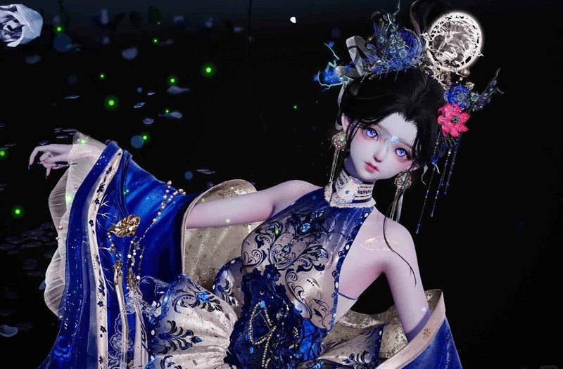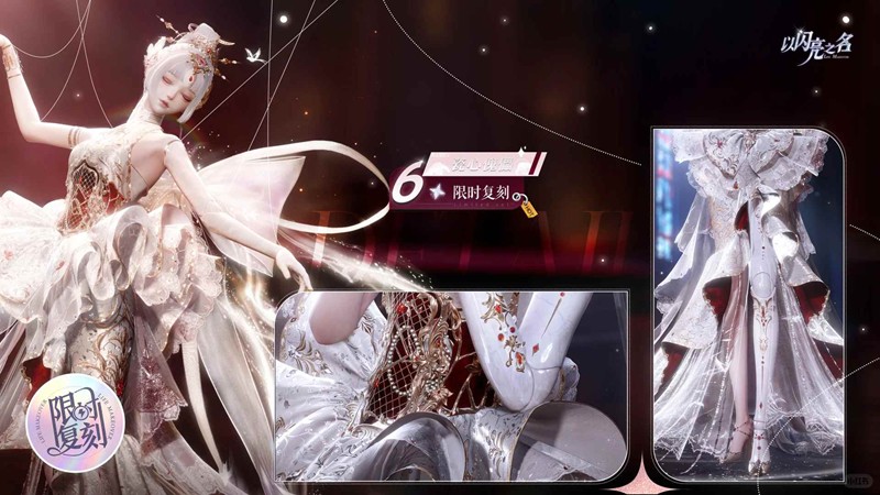 【视觉焦点】为了更好地展示中国白瓷震撼的无尽洁白与传统戏剧的怪诞艺术,设计与技术着重展现在融入腰部线条的复杂镂空鸟笼,无论是雕花纹路与珠宝的点缀,均耗费大量时间进行雕琢,双开门的鸟笼甚至是可以延轴打开,而机械鸟的骨骼也更符合其结构,动起来非常逼真灵动可爱,并且笼中的鸟儿可以跟随角色的动作飞出来跟角色互动。蝴蝶结外套和裙摆带有飞动的飞鸟特效,肩膀处的飞鸟纹身会流动着渐隐渐显。鞋跟能够打开、闭合,提供多种可能。