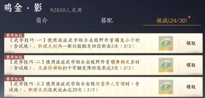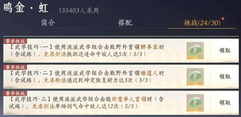 燕云十六声游戏的故事背景设定在五代十国与宋代的交替之时,玩家作为一名侠客,开启属于自己的武侠故事。游戏中会有多种不同的玩法风格,如剑术、武技、甚至是太极等,可以混合搭配剑法、近身战等来战斗。那么新赛季的流派挑战应该怎么完成呢?小编为你准备了一份攻略,一起来看看吧~