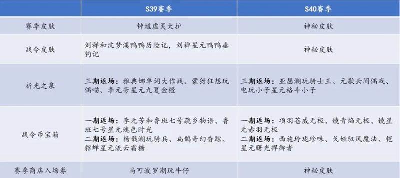 从表格中大家可以看到,有赛季皮肤,祈光之泉、战令币宝箱、赛季商店入场券的返场皮肤,一共14款下架,而对应的则有14款上架,不过目前还不知道S40的赛季皮肤,以及赛季商店入场券的返场是什么,只知道12款战令返场皮肤。