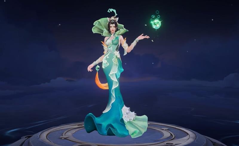 甄姬-逆浪荇歌以白玉荇菜和自然流水为灵感,将层叠的叶片和水波纹理拟作衣袂,展现出甄姬清新优雅的气质。技能特效整体以青绿为主色调,融入了荇菜元素,使技能释放时更具自然灵动之感。