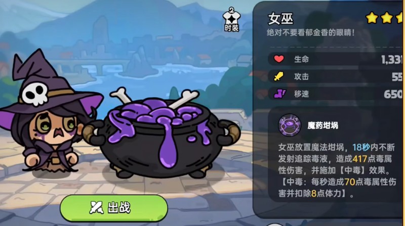 女巫是一个成长性极高的角色。装备毒属性武器后,她的攻击力会获得显著提升。女巫的主动技能可以放置魔法锅,持续发射追踪毒液攻击敌人并造成中毒效果。这个技能在团战中特别有效,能够持续削弱敌方血量,为团队创造优势。