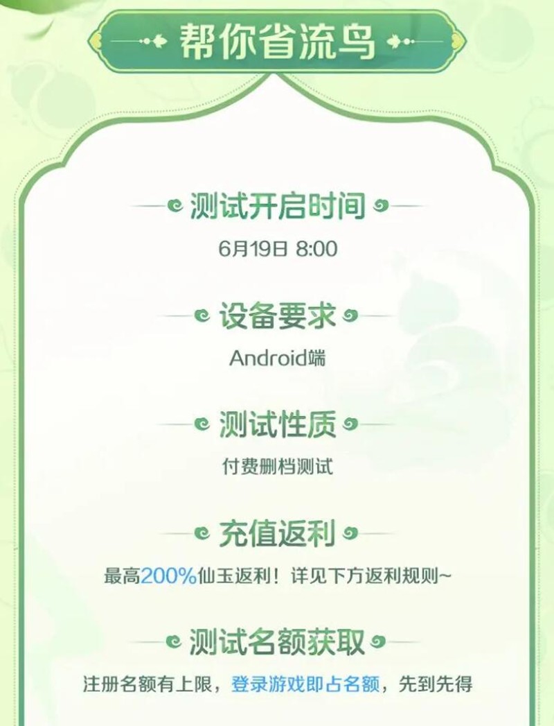 灵兽大冒险最新一轮测试已于2025年6月19日开启,本次为付费删档测试,采用先到先得的资格获取模式。测试期间,玩家成功注册账号并完成新手引导即可锁定测试资格,名额满后将关闭注册通道。目前测试仅开放安卓端,iOS用户需要等待后续测试或公测。