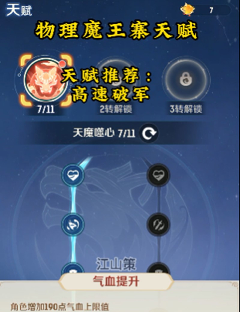 魔王寨是物理输出职业,天赋加点相对简单直接。建议优先提升攻击力、速度和防御力等基础属性,有余力的话还可以适当增加控制抵抗。在技能天赋方面,破军是核心技能,能提供3回合的狼月状态,大幅提升物理攻击力。