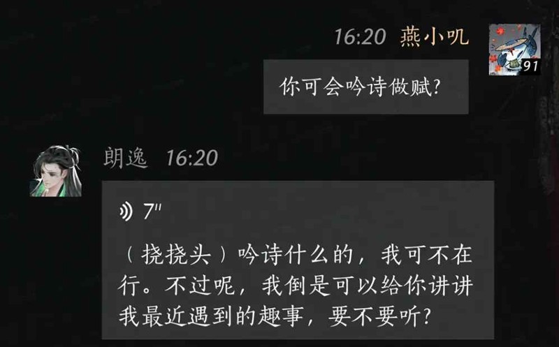 在当前版本中,新增了江湖故人「柳诗诗」与「朗逸」的语音聊天功能。从此江湖故人们也可以开口说话,不再局限于与游侠文字交流。