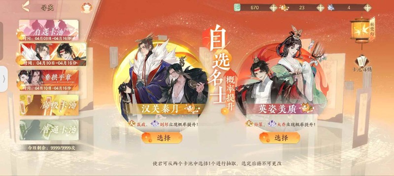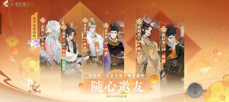 1.入坑时间:新年或周年庆,因为有自选盒子拿到后,选白居易,然后新手池选李白,双白可解决大部分副本,特殊的(幽墟端华)除外