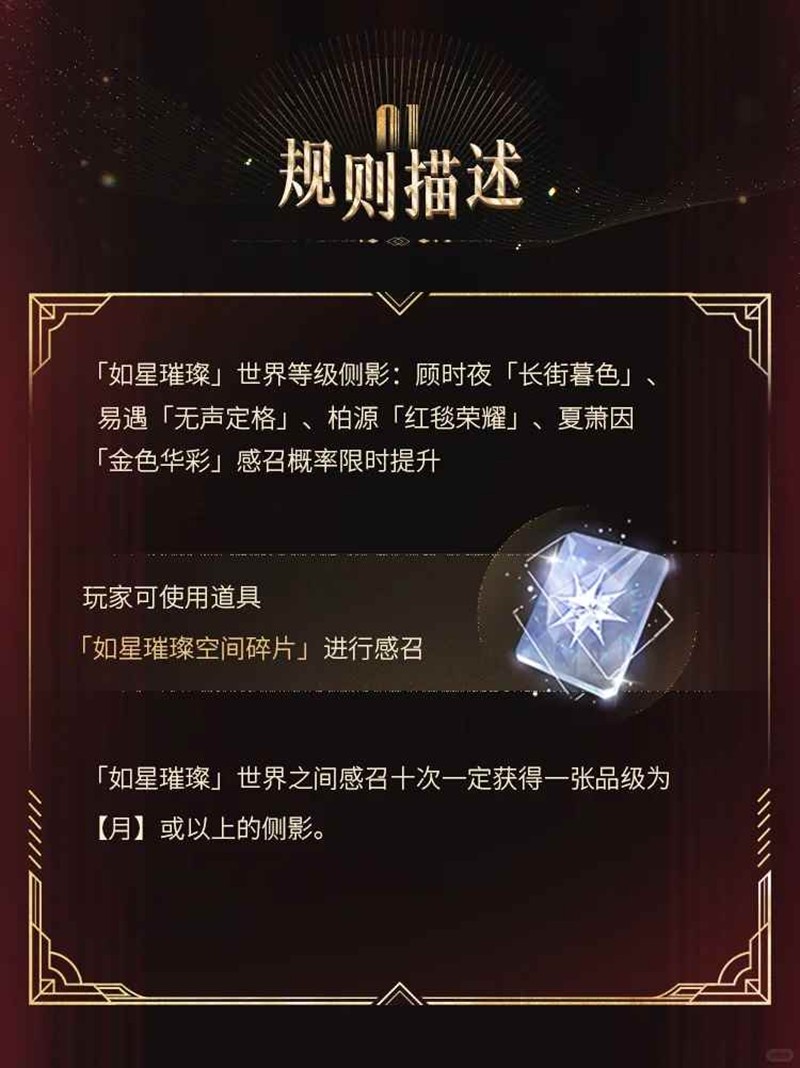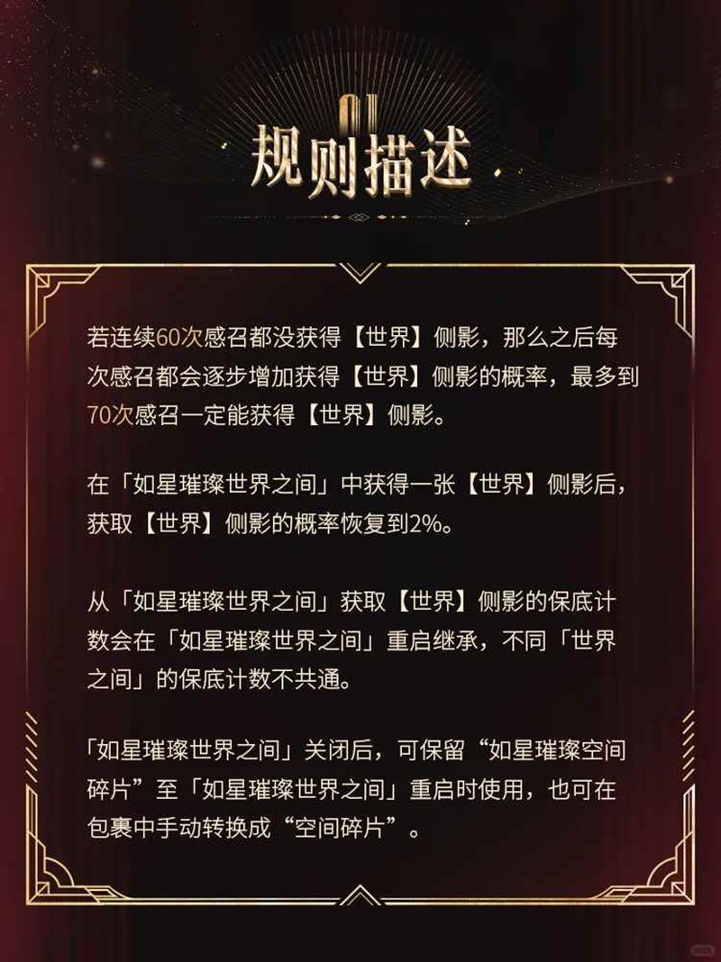 ✦在「如星璀璨世界之间」感召获得【世界】侧影时,有50%概率是「如星璀璨」限定侧影,若不是,则下次感召获得的【世界】侧影一定是「如星璀璨」限定侧影。