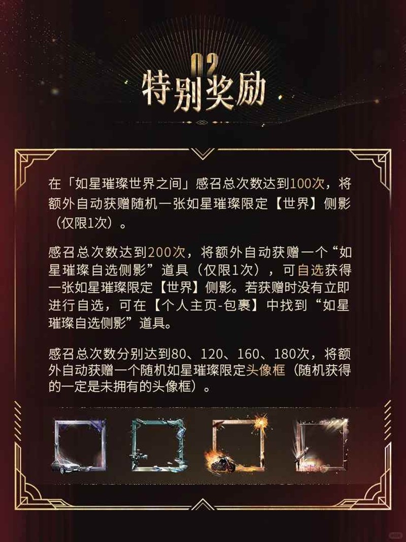 ✦感召总次数分别达到80、120、160、180次,将额外自动获赠一个随机如星璀璨限定头像框(随机获得的一定是未拥有的头像框)。
