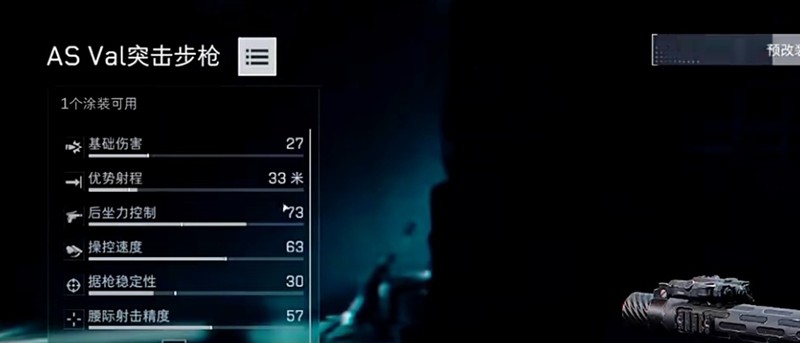 卢布发射器在游戏中被称为AS VAL突击步枪,属于微声特种武器类别。这把枪最大的特点就是拥有极强的穿透能力,基础伤害值达到27点,优势射程为33米。在操控性方面,后坐力控制73分,据枪稳定性30分,腰射速度57分,整体数据表现相当均衡。