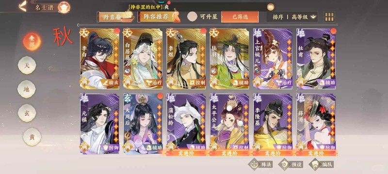 秋,有几关是极品小关,很烦人,比如倒数第二关,伤害和治疗都很高,这时候就需要我们用控制逃课,李煜算是比较好的选择,我自己尝试以及帮亲友通关都有用,双白是我有且仅有能用的,秋之实会上流血所以也需要元稹杜甫,如果没有控制卡,可以先用一下太平公主,灼华加命中猫,也算是逃课工具,但是倒数第二关就不要用了,会触发雷螭的被动,如果没有控制可以使用双白杜甫杨玉环大周后,前提是装备还不错能扛