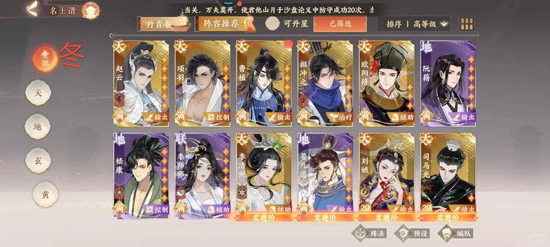 冬,嵇康万岁!!!可以看到我冬可以用的卡其实很少,而且都很牢,所以需要嵇康去创造奇迹,只要嵇康控得好,过关没烦恼。我的嵇康是有一套洗的还可以的玉衡和高命中使君猫(因为也会给太平用)最后一关是用的赵云嵇康李师师和李清照天命以及祖冲之(我有一个祖冲之的专属减暴赤金也发挥了不小的作用,但是金戈好不好用我就不清楚了,所以不要轻易下妙鲜包去抽,无辜浪费资源)