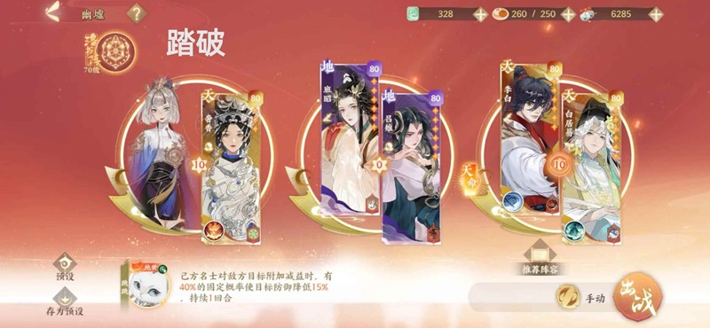 流光:对面受到攻击会回火,所以这关最好用单体,先打司马光,再打项羽,生存不够可以带窦奶减攻,脑测刘武李清照+灼华太平+白居易也能过
